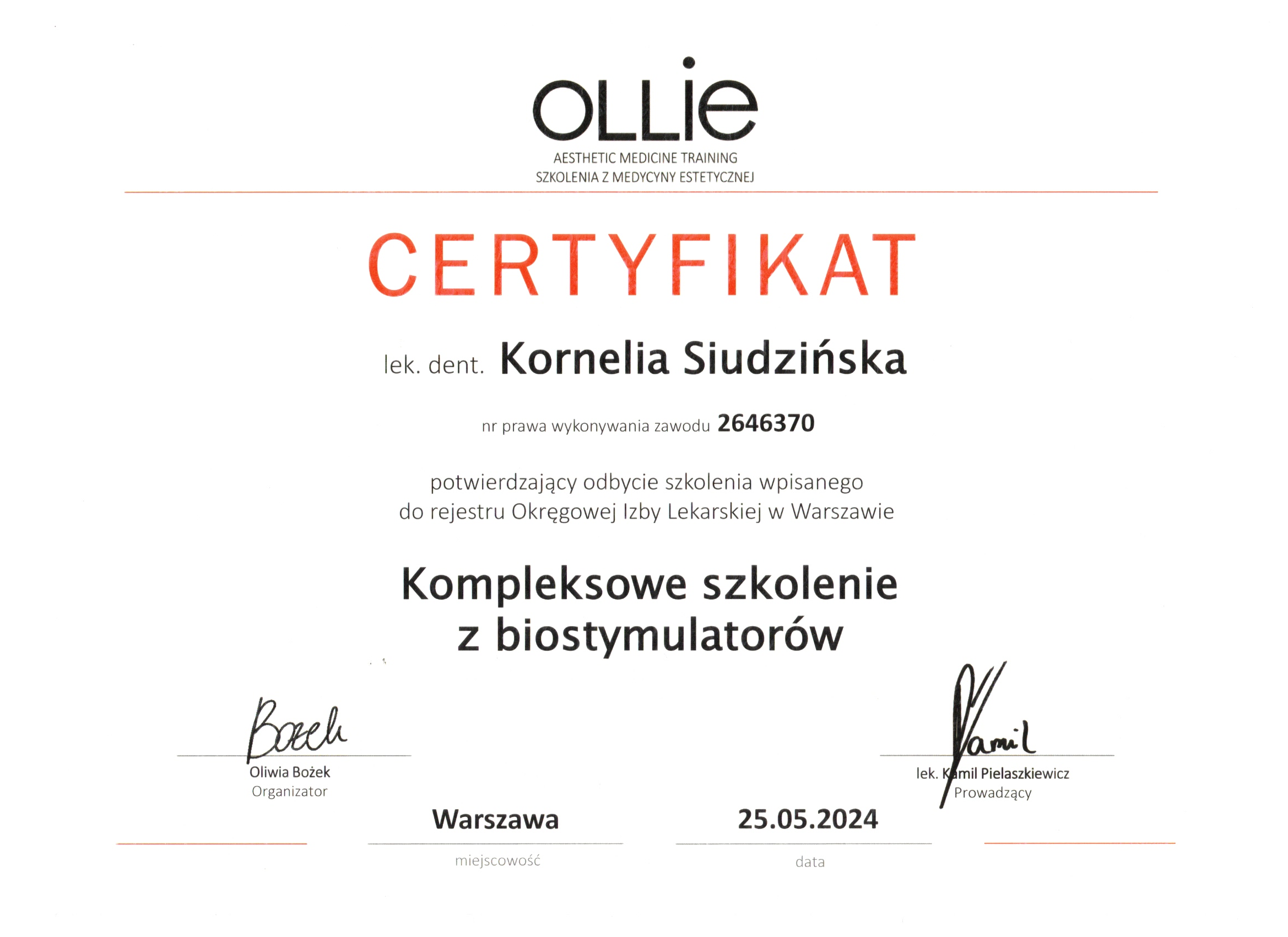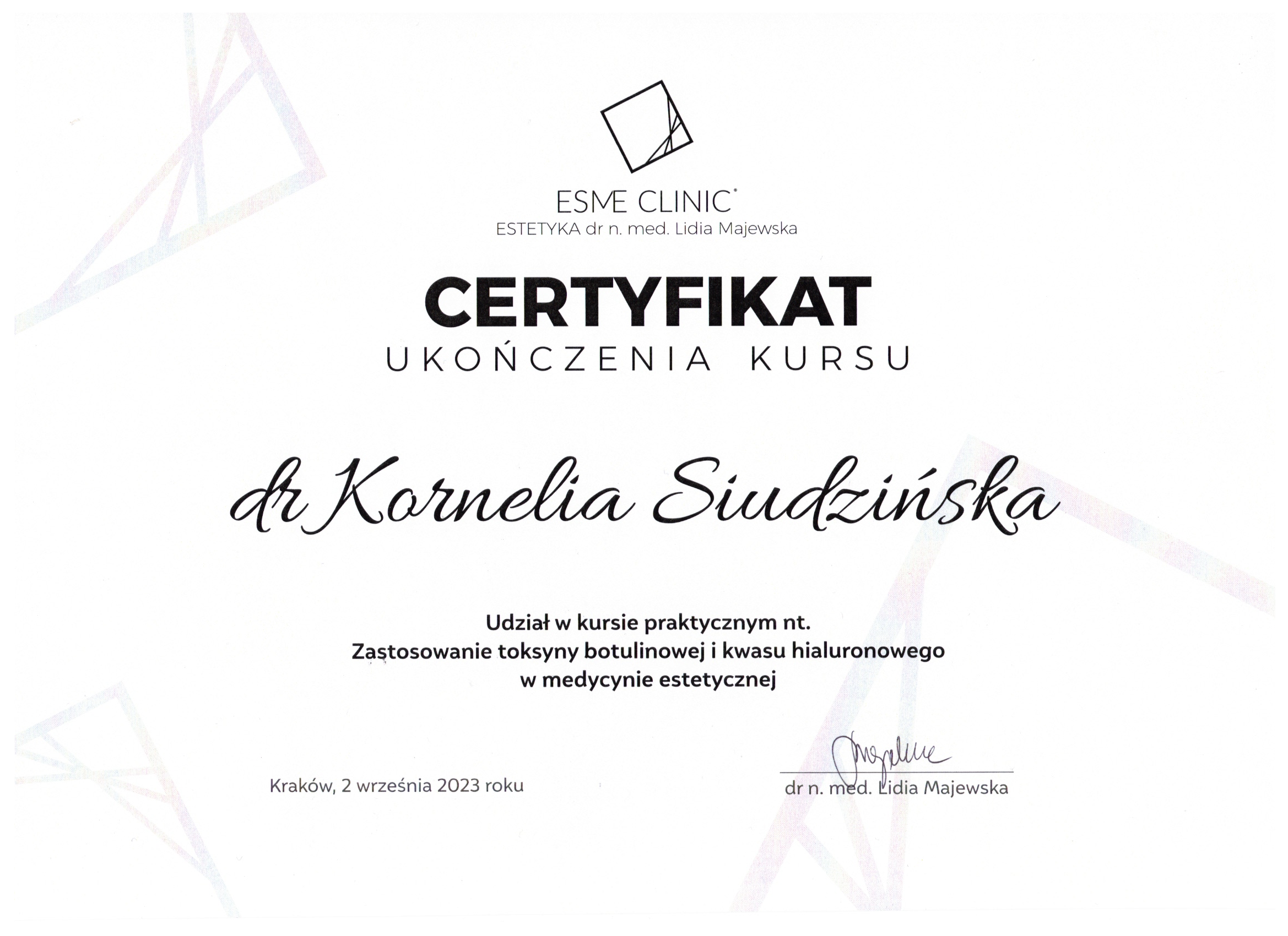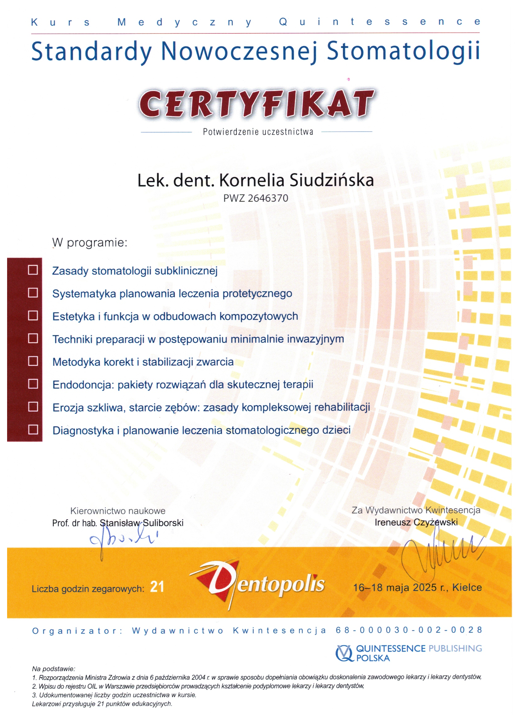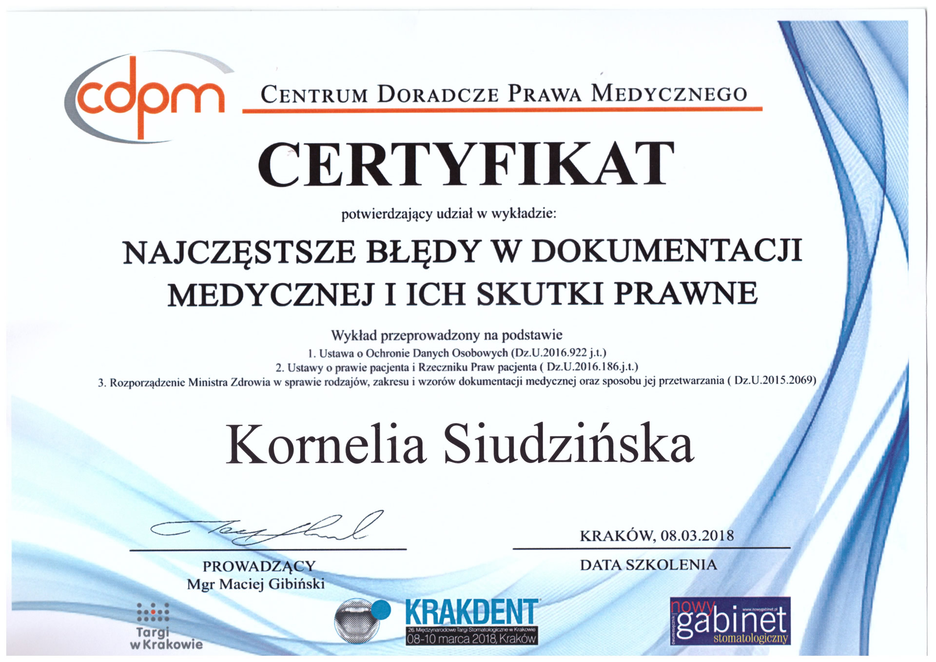 Ukończyła studia na Wydziale Lekarsko-Dentystycznym Collegium Medicum Uniwersytetu Jagiellońskiego w Krakowie w 2011 roku. Stale podnosi swoje kwalifikacje zawodowe uczestnicząc w licznych kursach i konferencjach. Swoim Pacjentom oferuje fachowe i rzetelne usługi stomatologiczne, stosując najwyższej jakości materiały i nowe technologie. Zajmuje się leczeniem zachowawczym, kanałowym (endodontycznym) przy użyciu mikroskopu, chirurgicznym oraz protetycznym. Wykonując metamorfozy uśmiechu swoich Pacjentów postanowiła pójść o krok dalej, więc ukończyła studia podyplomowe z Medycyny Estetycznej aby jeszcze bardziej podkreślić wizualne piękno, naturalność i harmonię.