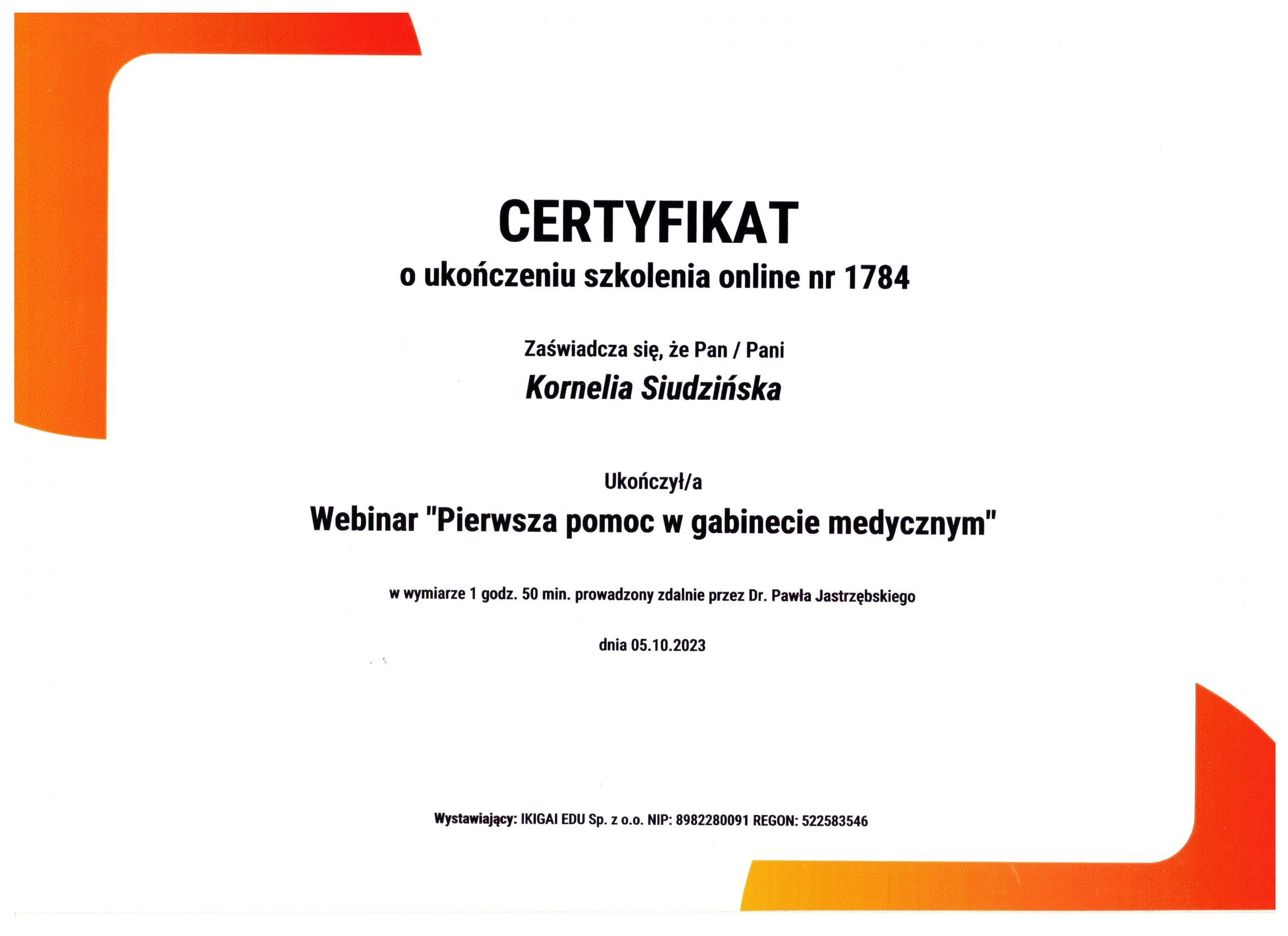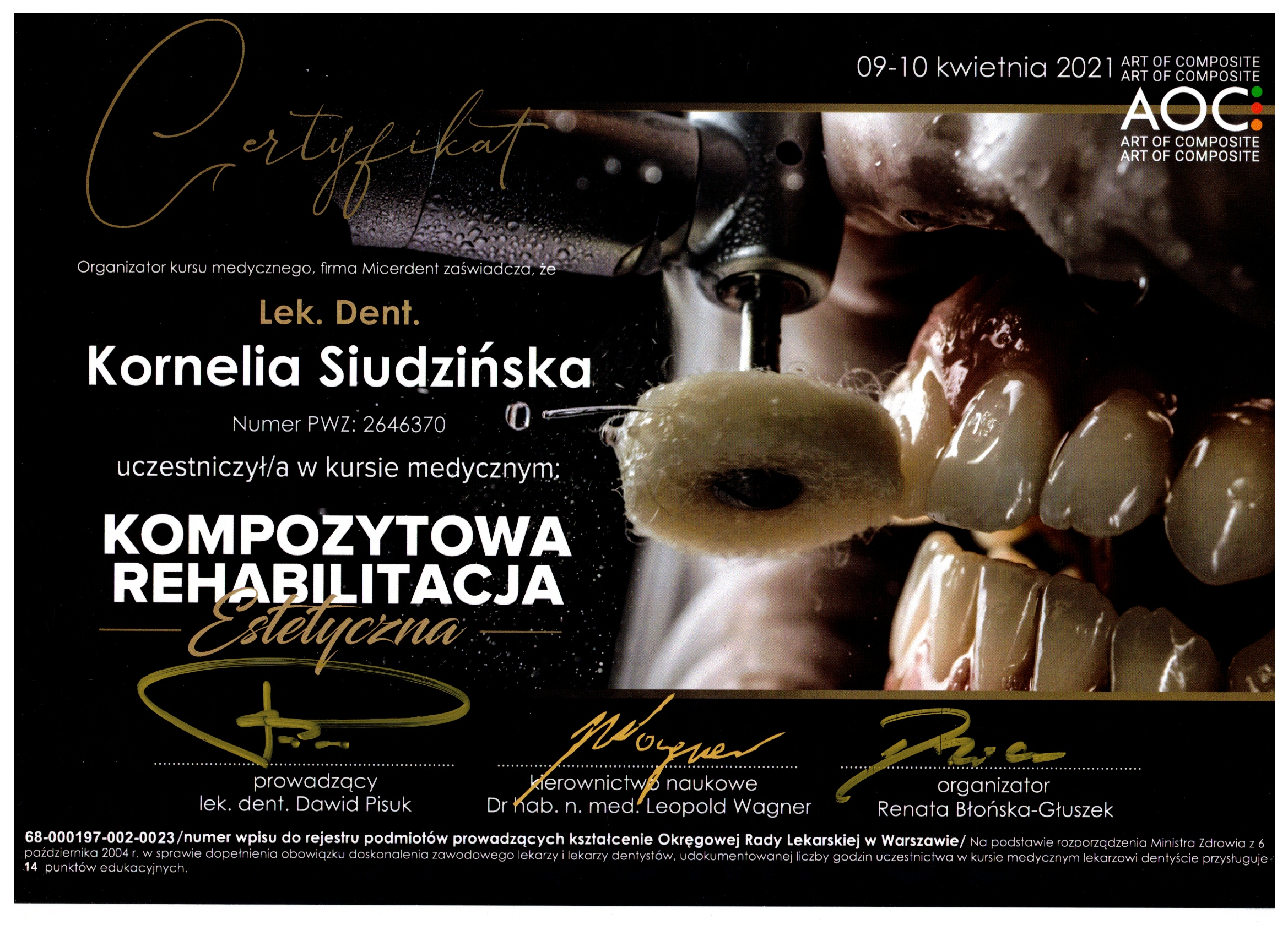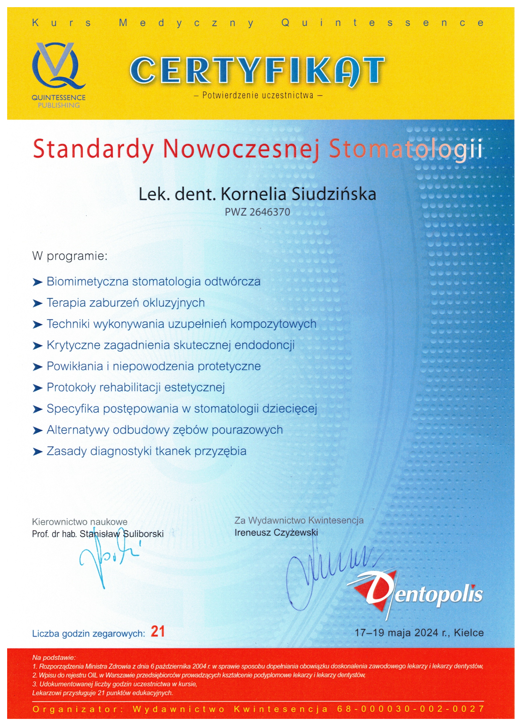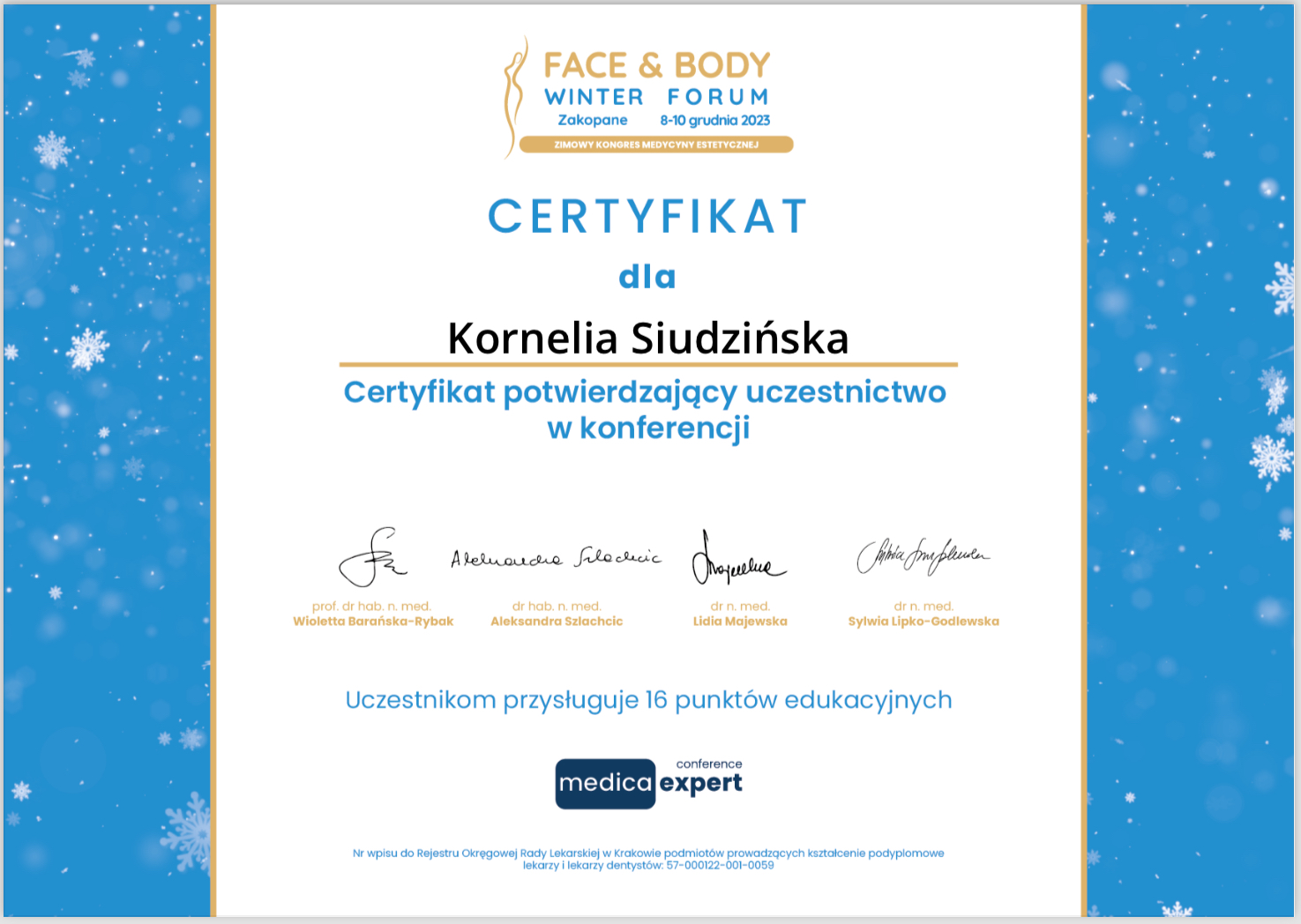 Ukończyła studia na Wydziale Lekarsko-Dentystycznym Collegium Medicum Uniwersytetu Jagiellońskiego w Krakowie w 2011 roku. Stale podnosi swoje kwalifikacje zawodowe uczestnicząc w licznych kursach i konferencjach. Swoim Pacjentom oferuje fachowe i rzetelne usługi stomatologiczne, stosując najwyższej jakości materiały i nowe technologie. Zajmuje się leczeniem zachowawczym, kanałowym (endodontycznym) przy użyciu mikroskopu, chirurgicznym oraz protetycznym. Wykonując metamorfozy uśmiechu swoich Pacjentów postanowiła pójść o krok dalej, więc ukończyła studia podyplomowe z Medycyny Estetycznej aby jeszcze bardziej podkreślić wizualne piękno, naturalność i harmonię.