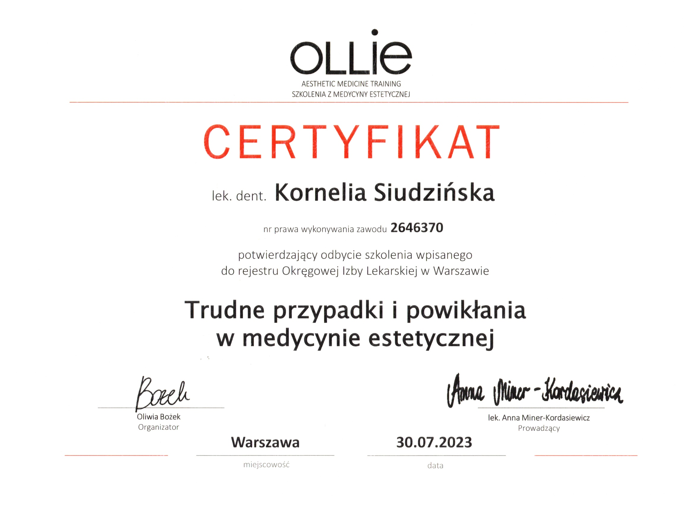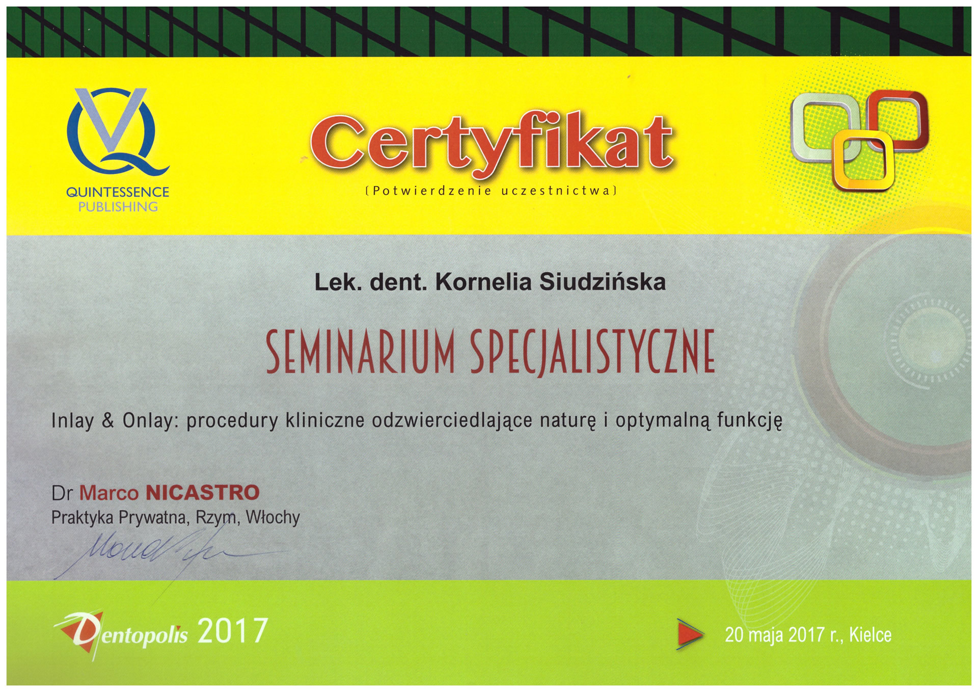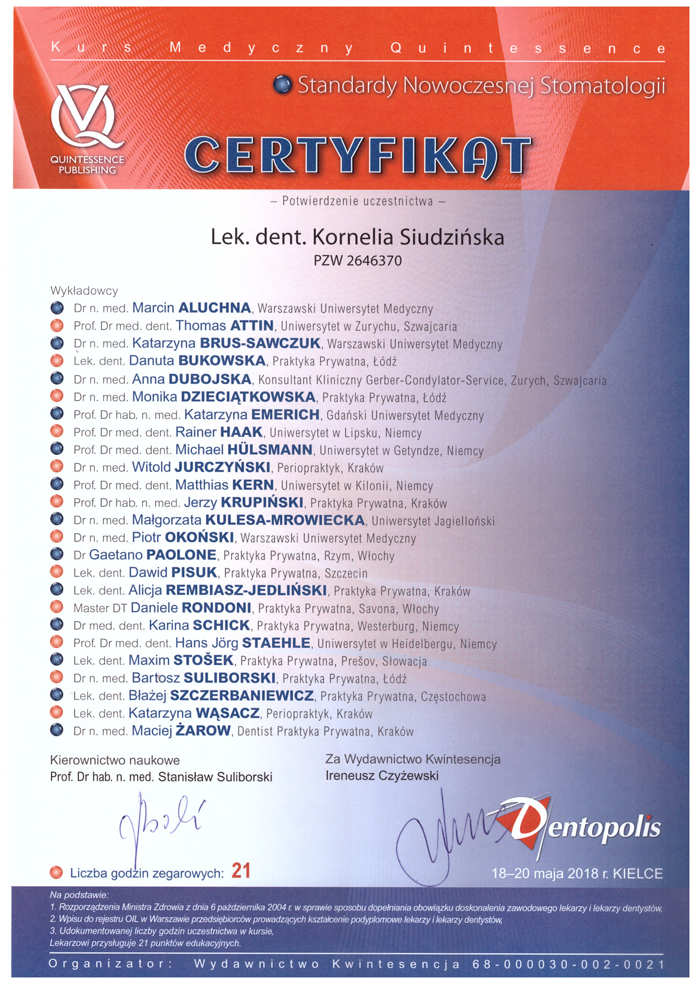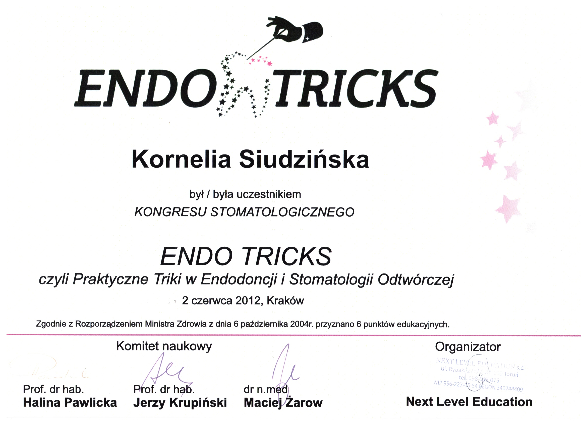 Ukończyła studia na Wydziale Lekarsko-Dentystycznym Collegium Medicum Uniwersytetu Jagiellońskiego w Krakowie w 2011 roku. Stale podnosi swoje kwalifikacje zawodowe uczestnicząc w licznych kursach i konferencjach. Swoim Pacjentom oferuje fachowe i rzetelne usługi stomatologiczne, stosując najwyższej jakości materiały i nowe technologie. Zajmuje się leczeniem zachowawczym, kanałowym (endodontycznym) przy użyciu mikroskopu, chirurgicznym oraz protetycznym. Wykonując metamorfozy uśmiechu swoich Pacjentów postanowiła pójść o krok dalej, więc ukończyła studia podyplomowe z Medycyny Estetycznej aby jeszcze bardziej podkreślić wizualne piękno, naturalność i harmonię.